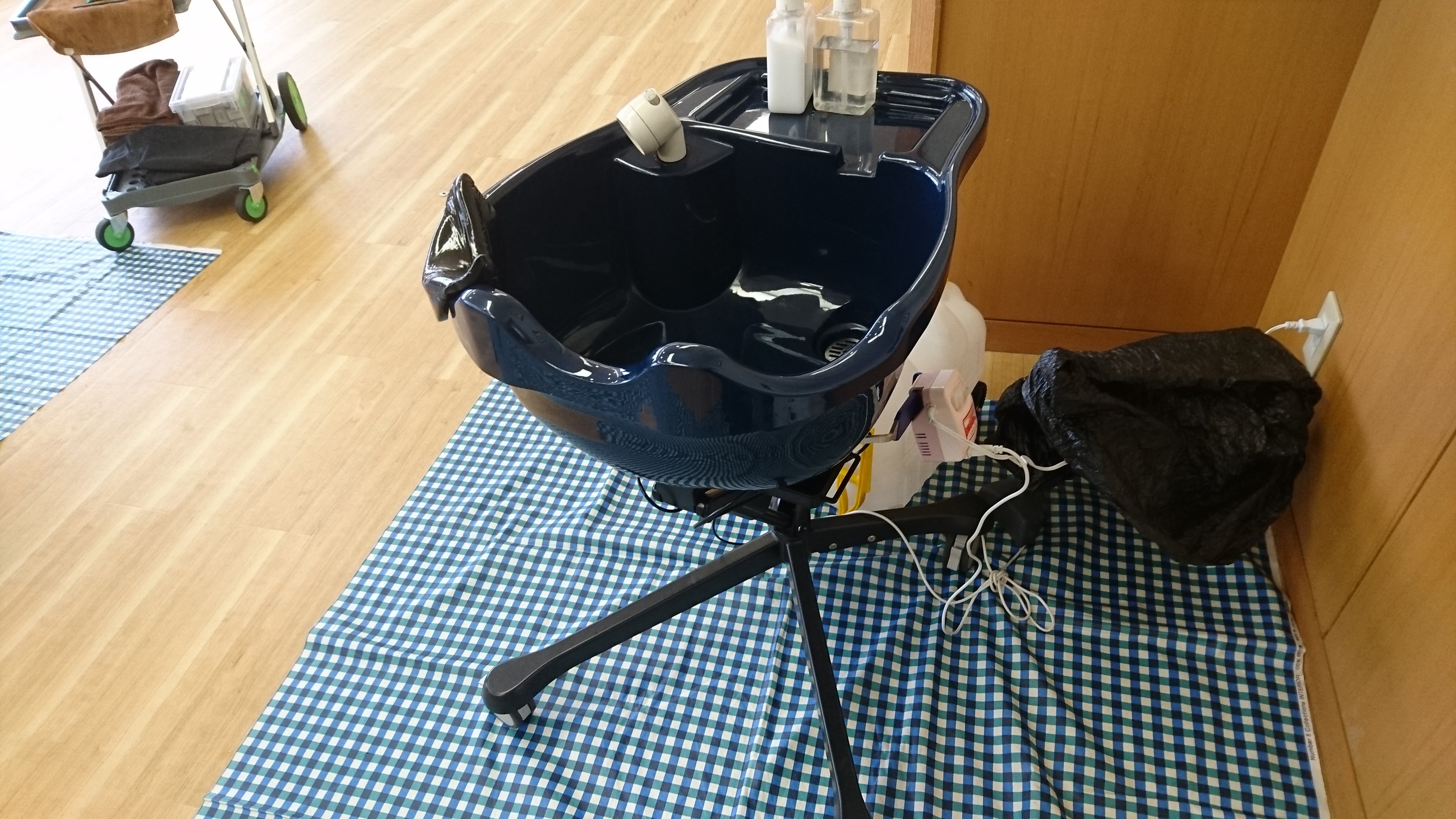 出張理美容師の体験から生まれたポータブルシャンプー台を持参いたします。